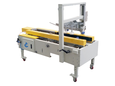 人工將撐開的紙板故入成封箱機后,該機能自動完成紙箱下 部折頁折蓋及上部折蓋、封箱等一系列工作。該機應用范圍廣、占地面積小、可單機使用或配合輸送設備實現自動化包裝。